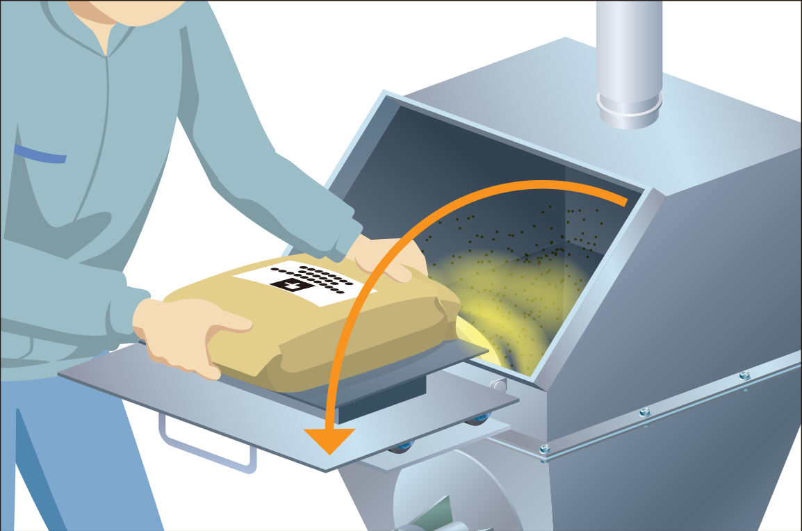 Our unique dust collection hood captures airborne dust during raw material supply,
